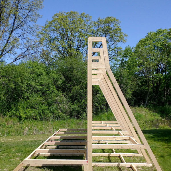 BILLBOARD SCULPTURE — Located in Waterloo Park just west of the Bandshell, the sculptural billboard holds a close-up image of the the nine-hundred-year-old oak, which is slowly drowning due to the water table rise from a nearby hydroelectric dam, built during the first Stalinist five year plan in 1932. In an effort to save the tree in the 1990s, the city of Zaporizhzhia erected metal poles, flags, and ropes, evoking a ships masts, creating the strange image of an ancient tree dressed up as a ship, slowly drowning on dry land. The billboard’s photograph crops out this monumental scaffolding, and focuses instead on the wire wrapped around its branches, and the concrete pushed into its broken limbs — attempts at holding its disintegrating body together, into some kind of maintained whole. The billboard faces Laurel Creek, part of the watershed of the Grand River, echoing the ancient tree’s location next to Upper Khortitsa Creek, that flows into the Dnipro just before the dam. The billboard’s sculptural form draws from the dam itself, designed by constructivist architects Kolli and Vesnin, and built with expertise from Canada and US engineers, who had just built massive colonial dam projects in Turtle Island before traveling to southern Ukraine.