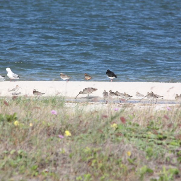 In autumn, migratory shorebirds, such as the Eastern Curlew (Numenius madagascariensis), in the Pumi…